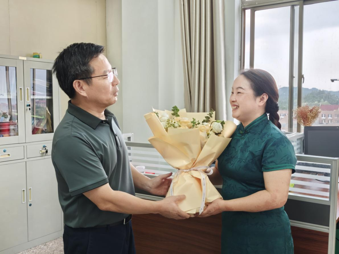 走访慰问中,曾德生与教师代表胡菁慧、晏志伟两位老师进行了亲切交谈。他亲手送上寓意敬意与祝福的鲜花,并关切地询问了他们的工作、生活情况,听取了他们对学校发展的意见和建议。