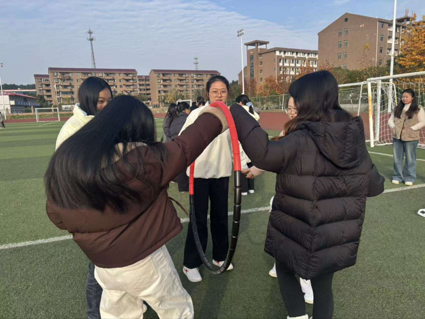 活动现场气氛热烈,设置“一圈到底”与“珠行万里”两个团队项目。在“一圈到底”环节,队员们手拉手围成圆圈,在保证不松手的前提下,通过钻、抖、跨等灵活动作,让呼啦圈在团队中快速传递。这不仅考验了队员间的身体协调性,更在欢声笑语中拉近了彼此之间的距离。
